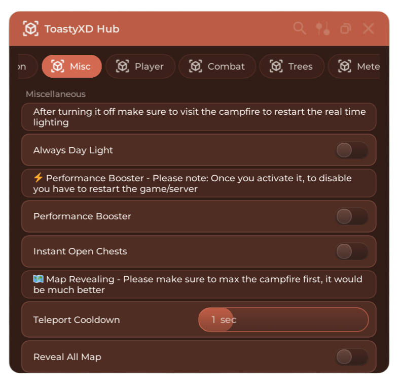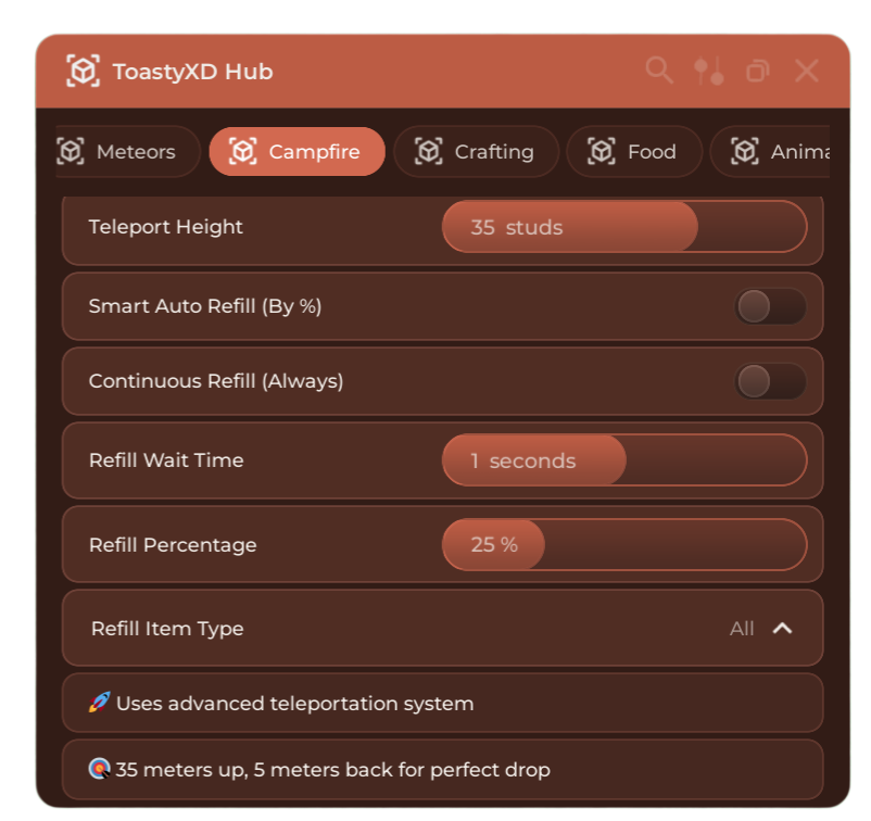 The first feature I liked is Auto Fill Fire. This feature keeps the campfire burning all the time by adding logs or fuel automatically. I didn’t have to check the fire again and again, which made surviving the nights much easier. It also saves a lot of time because the script does the work for me.